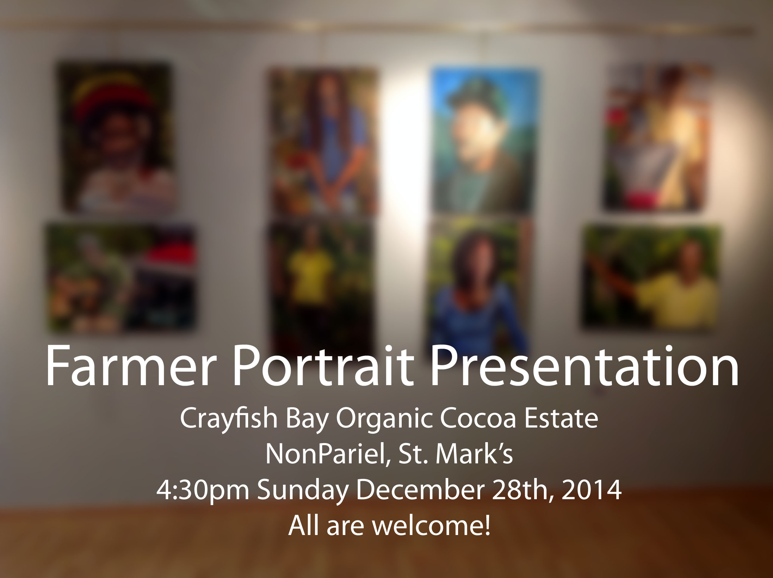 Nestled on the drying trays of the cocoa boucan, eight portraits sat, awaiting their unveiling to a most appreciative audience. Months in the making, the artist, Asher Mains, had painted in the traditional classic oil painting style, images of eight cocoa farmers. The farmers were the audience gathered there, and a few visitors who were staying at the Crayfish Bay guest house. The literati of art were absent, as were the politicians and TV cameras. No fashonistas stood with wine glasses perfectly poised, just hoping someone would notice their shoes. No paparazzi showed up. It wasn’t Art Basel in Miami.